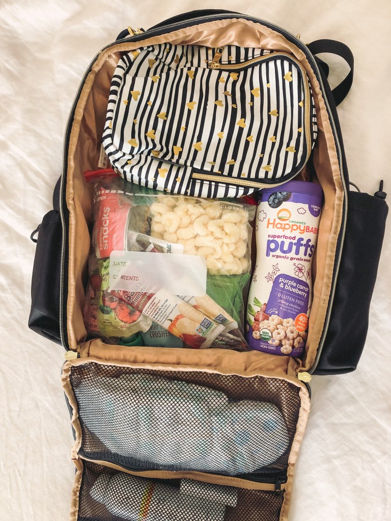 • Snacks, snacks, snack! I basically carry a small pantry around with me, now with two kids I have enough snacks to hold them over if we are out during a meal time. I keep the snacks in a zip lock baggie, this way they are contained and easy for my toddler to pull out instead of taking everything out to find what she wants.