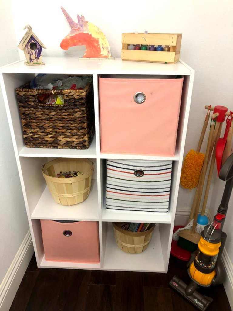 My original idea was a room of bright muted colors (not pastel) and neutral furniture. I wanted the space to be cute and accessible for the girls, but also semi “child proof”. The cubes hold art supplies, playdough, crayons, stickers, extra coloring books, puzzles and back up supplies.
