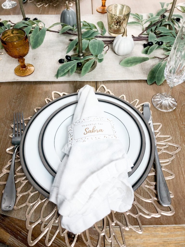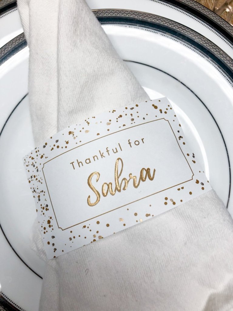 I also brought back my homemade thankful place cards. This year, I made napkin rings and after printing them out, I lightly traced the names with a gold metallic pen to add a bit of a pop. This is such an easy touch and guests always enjoy this!